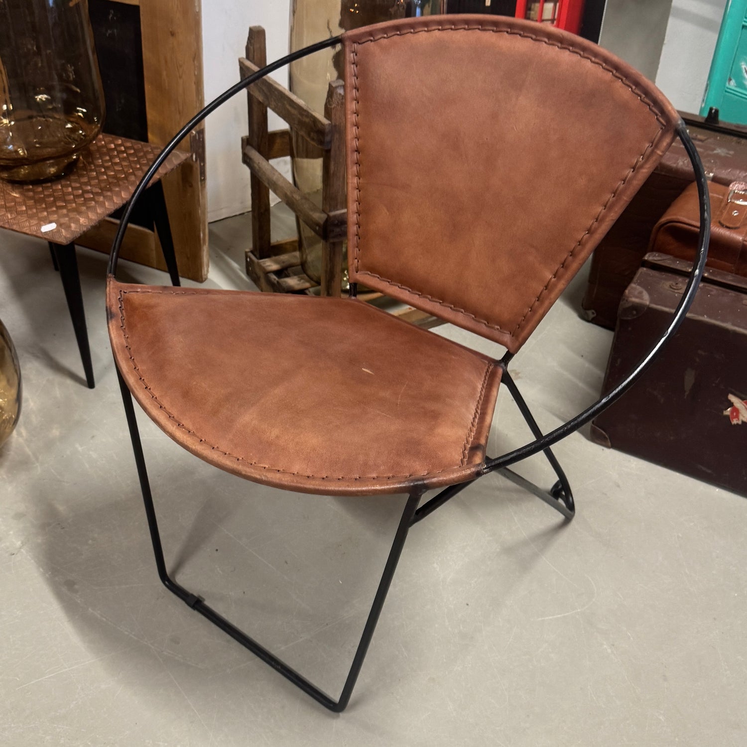 Lækker lounge stol med patina på stillet. Beklædt med brun læder. Sidder i den som en drøm